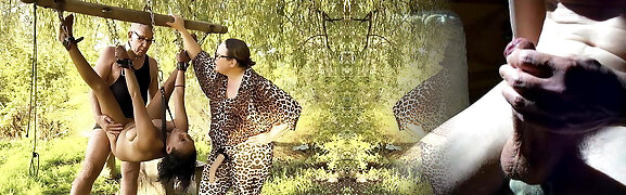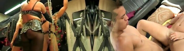 Busty milfs play with a skinny loser in the dungeon