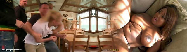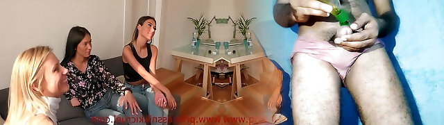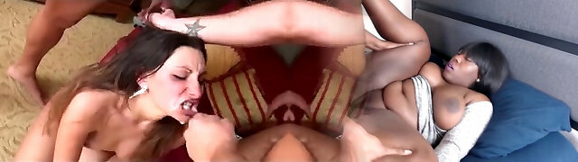 Dominant ebony cougar plays with a bunch of ebony housemaids on the couch