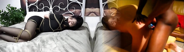 Wondrous Blonde Teen with perfect ass and small feet spanked hard in her shiny dark-hued bodystocking then fuck with a huge wood