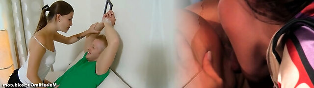 Schoolgirl tied to stocks finger-tickled by teacher while mouth fucked by schoolguys ejaculates to mouth and face in the office feature
