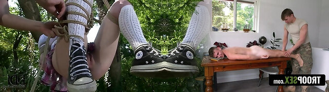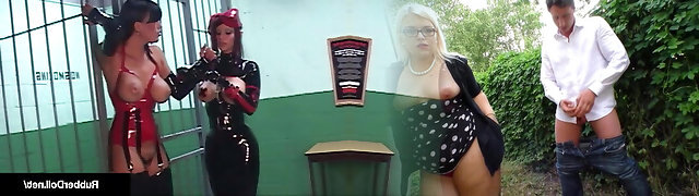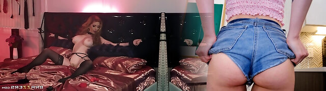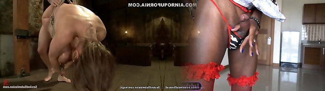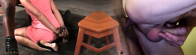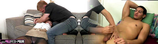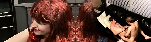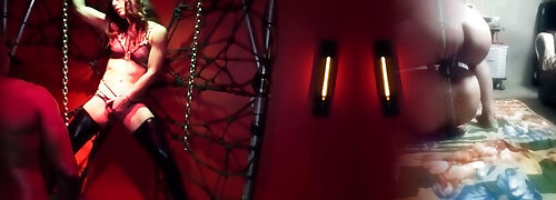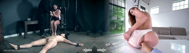 Stud rails strap on dick after getting his dick squeezed and bound by rugged domme with fiery red hair