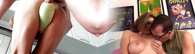 Big-chested ash-blonde filling her shaved pussy with a long brutal dildo