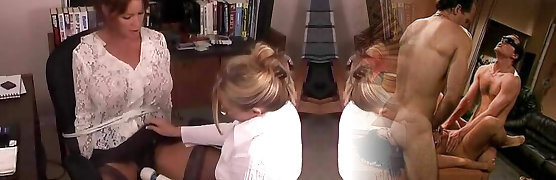 Schoolgirl tied to stocks finger-tickled by teacher while mouth fucked by schoolguys ejaculates to mouth and face in the office feature