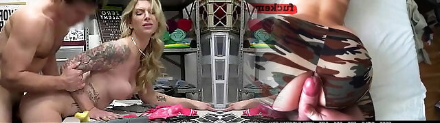 Brunette Tattooed Thief Pummeling Two Fat Cocks In The Back Office - Charlie Valentine - Shoplyfter Mylf