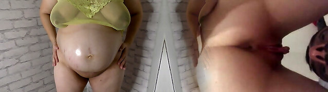 Slutwife stepmommy Milky Mari do a oiled massage of her hefty pregnant belly and huge lactating boobs!